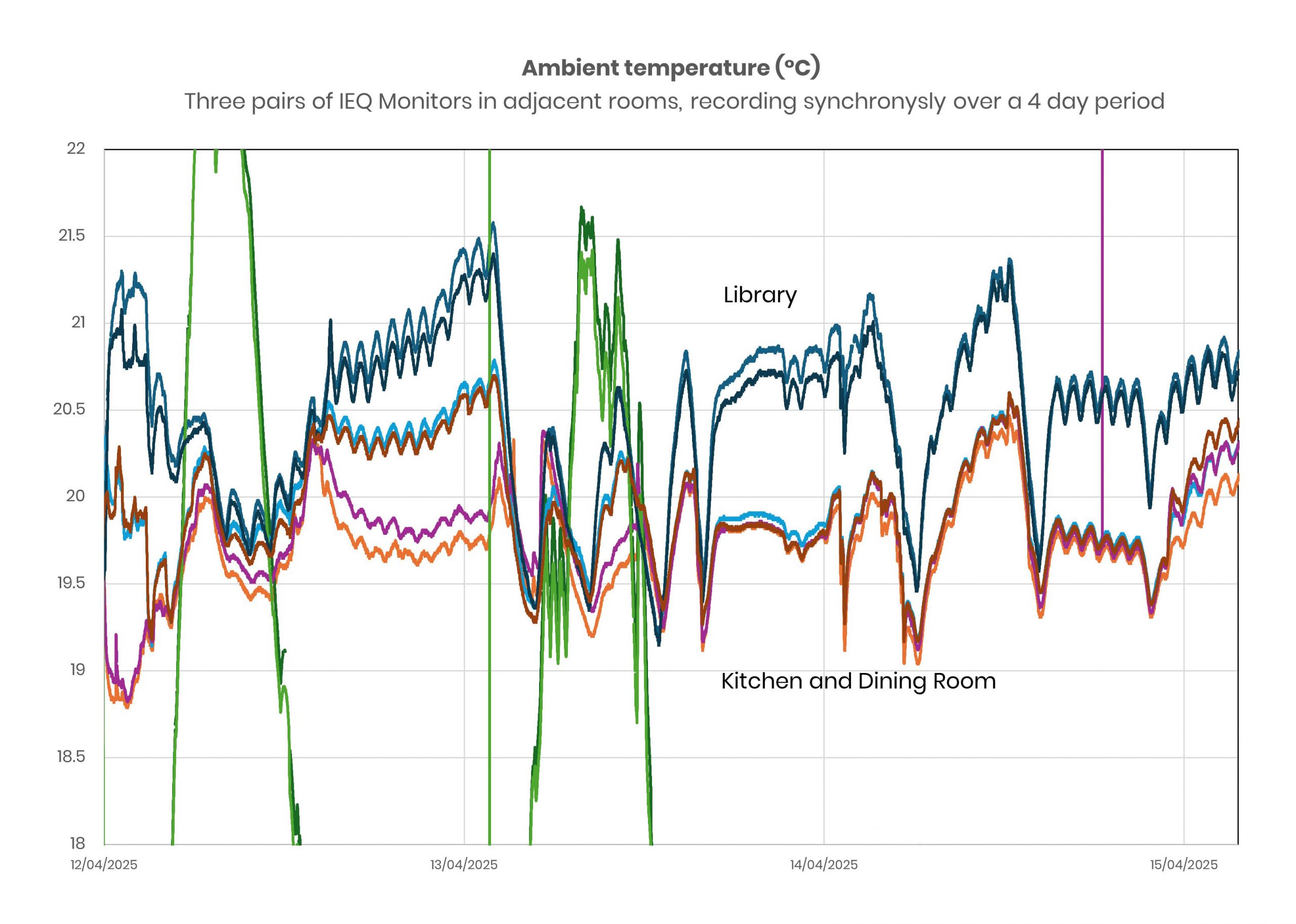 IEQ Monitors can be deployed as a network to create detailed environmental maps across several rooms, floors, or even entire buildings. Network mapping is necessary for complex spaces with varying ventilation and usage patterns. Competitors offer only standalone sensors with no insight into the overall built environment .